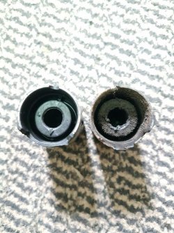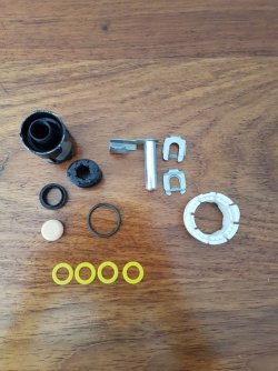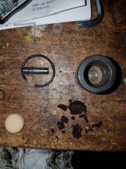 Vielleicht interessiert es ja noch jemanden, wie die Verschleißteile des Schaltgestänges im Vergleich zu den Neuteilen aussahen. Es wird grundsätzlich empfohlen das Schaltstangengelenk komplett zu ersetzen. Dies habe ich zu spät gelesen und mir nur das neue Schwämmchen und den neuen Sicherungsring bestellt. Bei Überprüfung des Gelenks konnte ich aber außer des fast nicht mehr existenten Schwämmchens keinen großartigen Verschleiß erkennen und so wurde das alte wieder eingebaut.