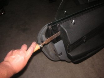 Nun muss die Verkleidung runter. Da keine Schrauben mehr zu sehen sind, kann die nur gesteckt sein, also mit roher Gewalt das Teil runterreißen. Ich habe dort angefangen wo eh schon Gummi den Lack schützt, da lässt sich super eine Art "Hebel" ansetzen.
