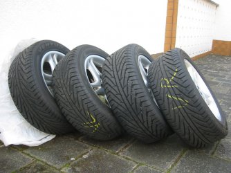 Die Räder waren beim Kauf auf meinem BMW Z3 Coupe montiert und wurden nach kurzer (Fahr)Zeit gegen 17er getauscht. Die Felgen weisen normale Gebrauchsspuren auf, ohne Bordsteinkontakt. Alle Räder sind gewuchtet und liefen bis zur Demontage ohne Probleme (bin selber ca. 800km damit gefahren). Einen Höhen- oder Seitenschlag konnte ich nicht feststellen, obwohl der Z eine wirklich sehr direkte Lenkung hat. (ihr wisst was ich meine