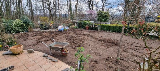Definitiv nein. Abtragen,umgraben/pflügen, Walzen evtl mit was Sand darunter( hab noch Blumenerde und Kalk und Hornspäne mit vermischt), leicht aufrauen und Rasen drauf. Jetztist viiiel Wasser angesagt.Mit den Bäumen meinte ich die großen im Hintergrund an der Grundstücksgrenze